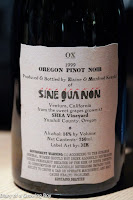 1999 Sine Qua Non The Ox - 100% pinot noir. 14% alcohol. Really fragrant nose. Served an hour after decanting. A little meaty with leather notes.
